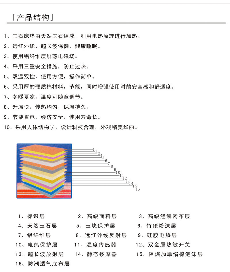 玉石床墊由天然玉石組成,利用電熱原理進(jìn)行加熱。遠(yuǎn)紅外線、超長(zhǎng)波保健,健康睡眠。使用鋁纖維層屏蔽電磁場(chǎng)。